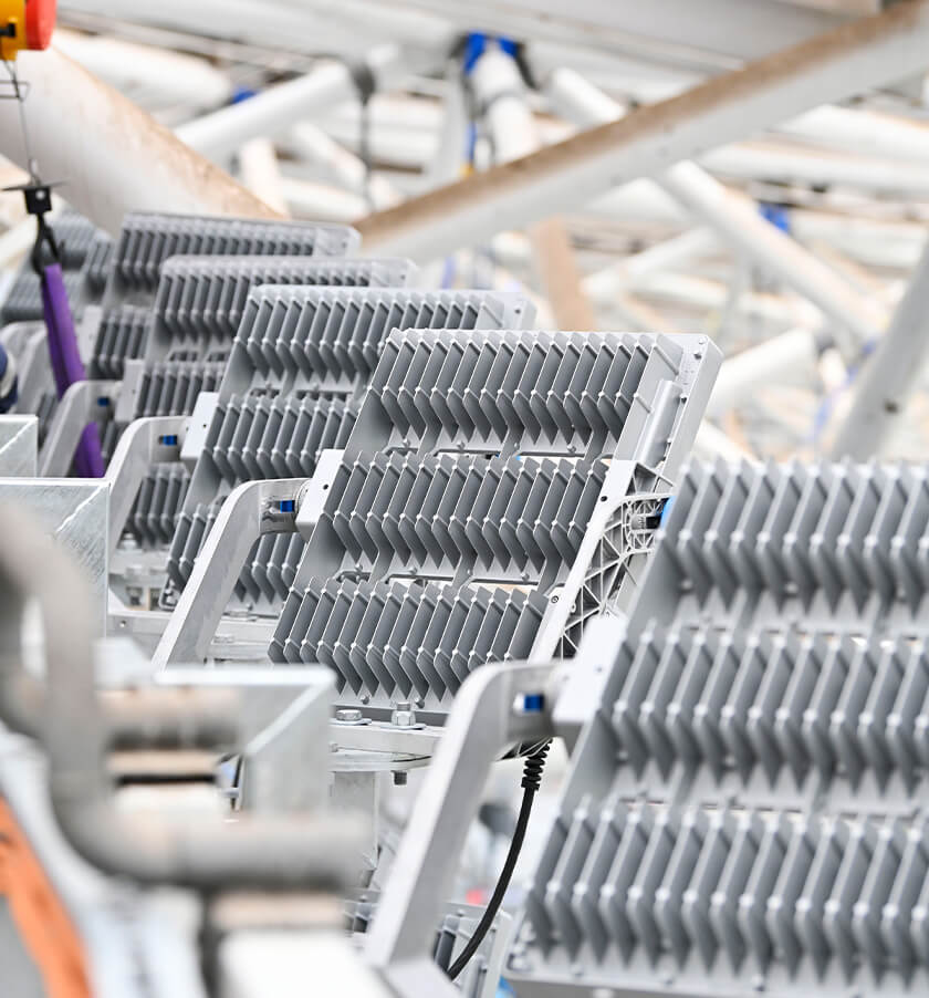 The venue’s scale and architectural constraints demanded custom bracketry and precise modelling to ensure the lighting performance met the required levels for both sporting and broadcast applications.