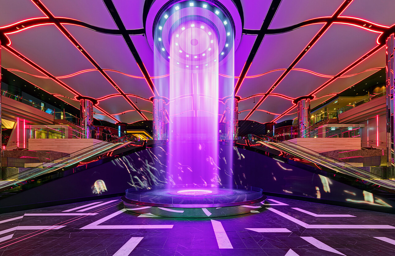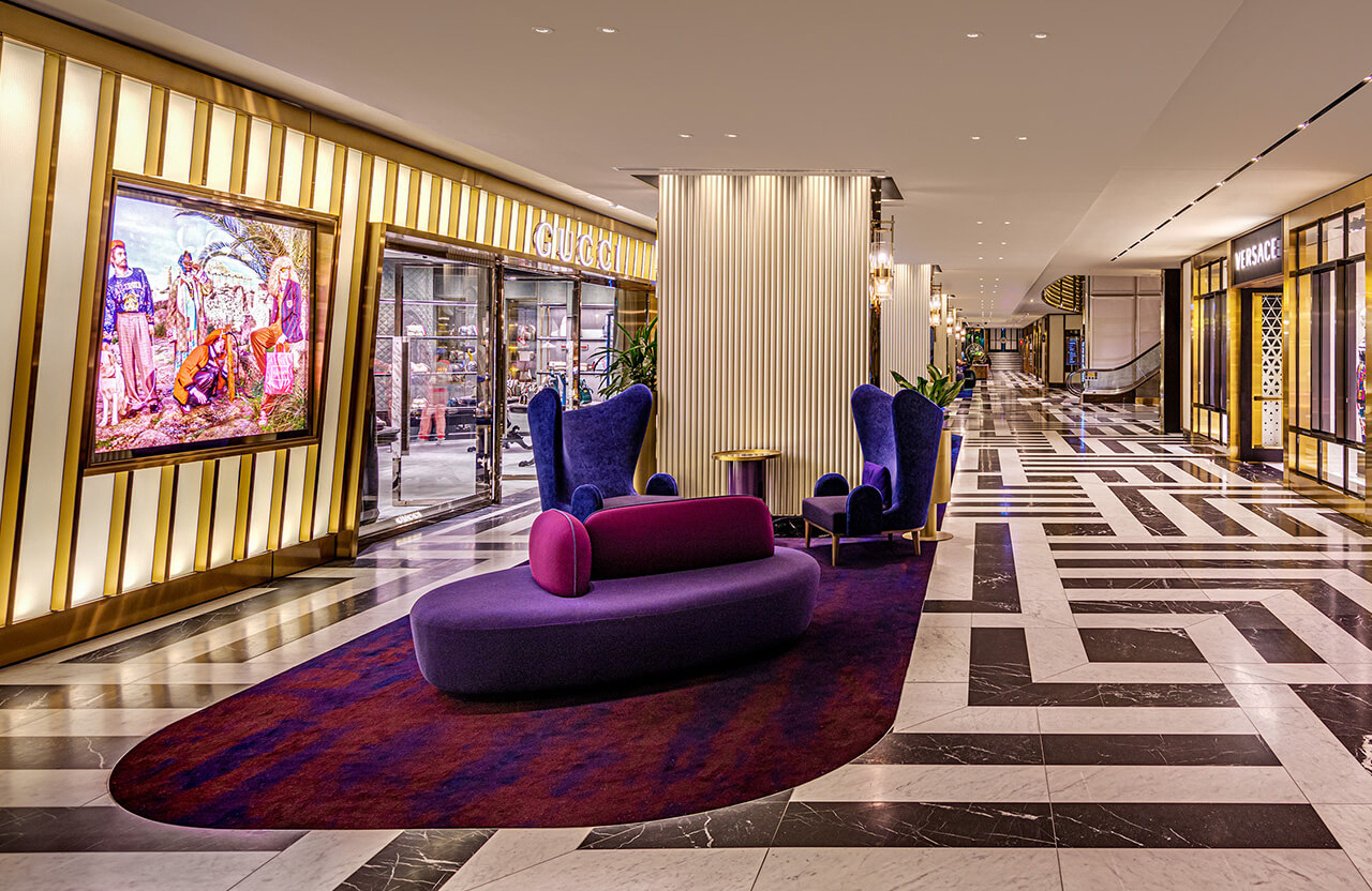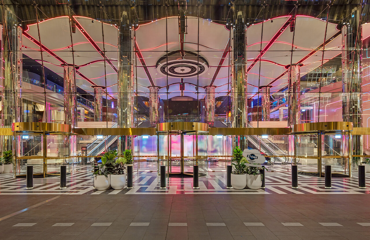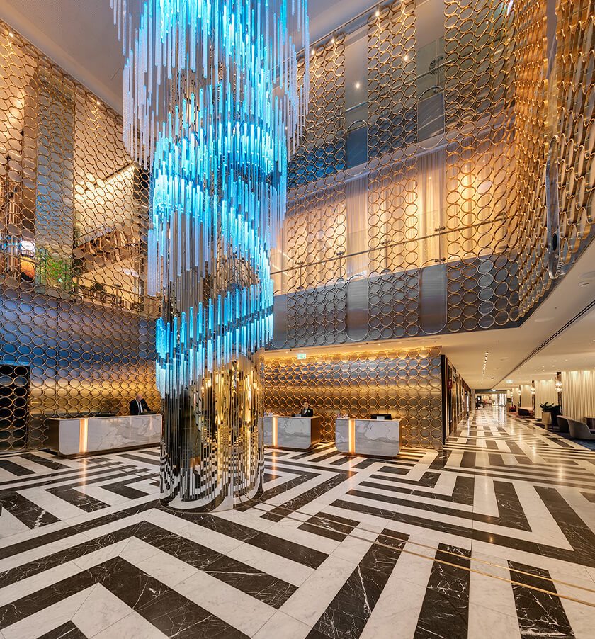 The refurbishment was of the western precinct of their iconic casino and hotel. This exciting project involved creating Australia’s first 8k, 25 metre curved LED screen, a permanently installed water show, 4,800 gold rings spanning over three levels, custom made revolving doors, 40,000+ individual pieces of stone and 2,000+ light fittings.